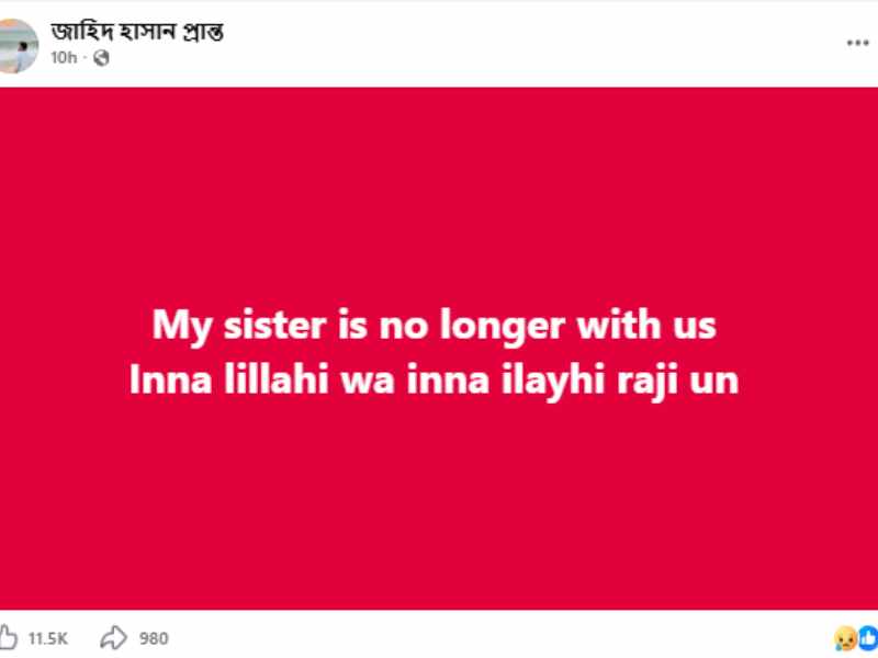শনিবার সকালে সামাজিক যোগাযোগমাধ্যম ফেসবুকে দেওয়া এক পোস্টে জাহিদ হাসান লেখেন, ‘আমার বোন আর নেই। ইন্না লিল্লাহি ওয়া ইন্না ইলাইহি রাজিউন।’ পরবর্তীতে তিনি গণমাধ্যমকে জানান, যুক্তরাষ্ট্রের আইনশৃঙ্খলা বাহিনী ভোরে তাদের সঙ্গে যোগাযোগ করে এ তথ্য দিয়েছে।